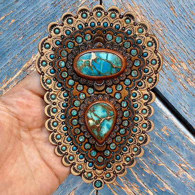 Each piece is crafted with love, pairing handpicked gems with tooled leather to create timeless designs.